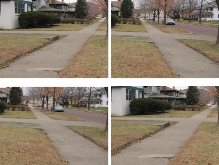 Look at the picture above. The top pair of sidewalks look parallel, right? Now look at the bottom pair. Those sidewalks are clearly not parallel, but these are the same sidewalks as in the first picture with the right and left sidewalks switched. People also tend to misperceive the orientation of the sidewalks. In order to understand this effect, we directly measured the accuracy of perception when viewing multiple pictures. More Info ->