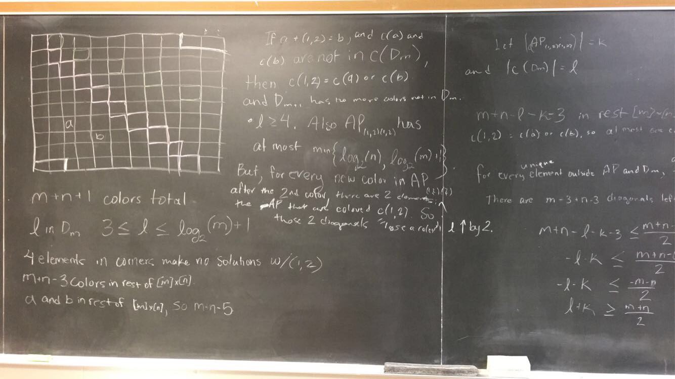 Consider the set of ordered pairs [m]x[n] and the equation x+y=z. A rainbow solution is a subset of [m]x[n] of three ordered pairs that satisfy the equation. If we assign each ordered pair a color, what is the least number of colors we need to use to guarantee that there exists a rainbow solution? We call this number the anti-Schur number of x+y=z in [m]x[n]. More Info ->